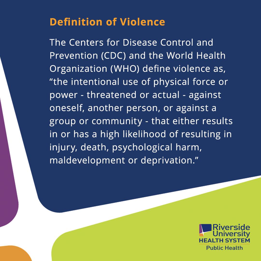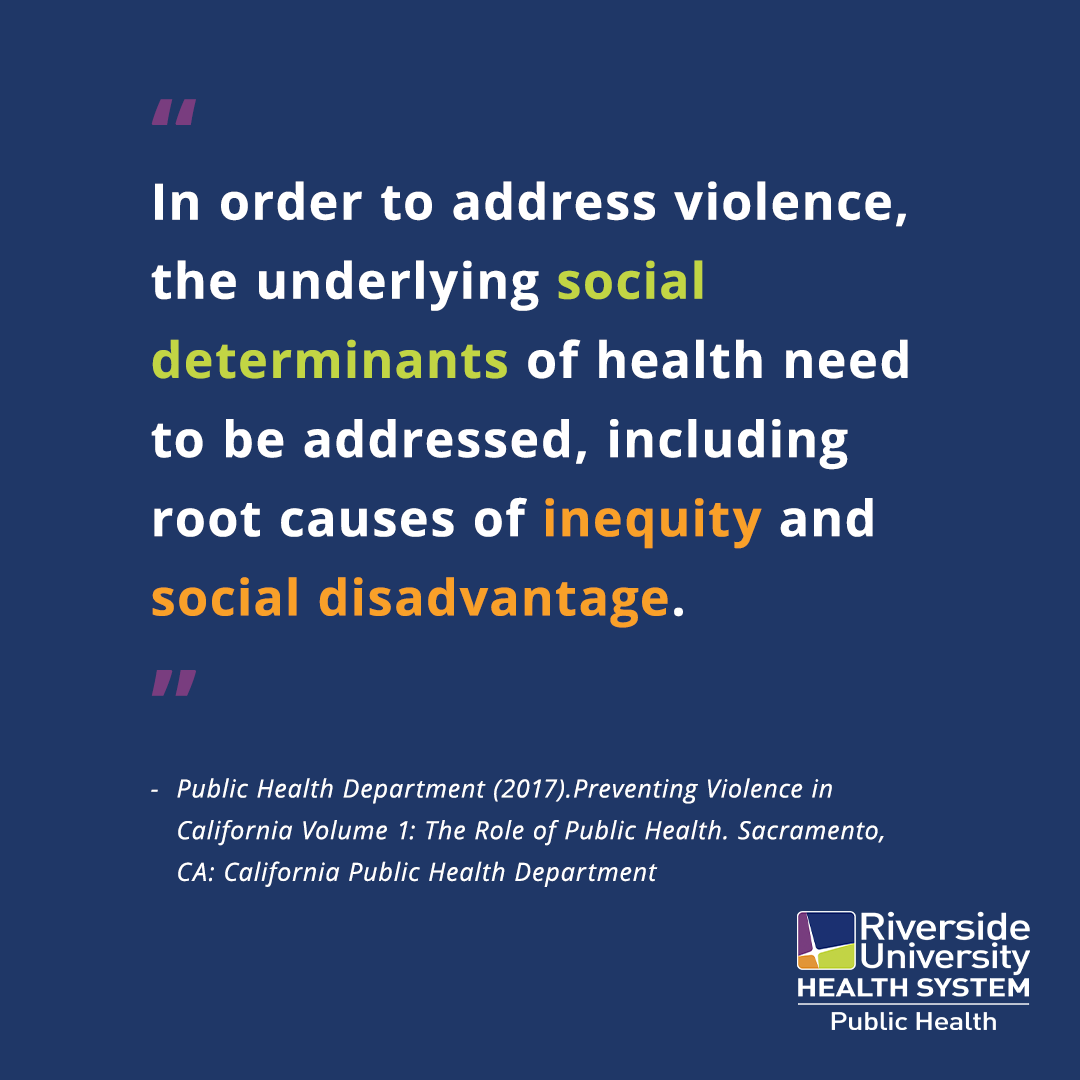 Violence touches the lives of thousands of Riverside County residents each year. While the causes of violence are complex, there are opportunities across the lifespan to prevent violence and offer pathways to healing for those who experience it. With community safety being a pillar of our work, the RUHS-PH violence prevention program aims to understand the problem of violence through data and assessments, support primary prevention programs that help prevent violence from happening, and promote services and resources that promote healing after violence has occurred.