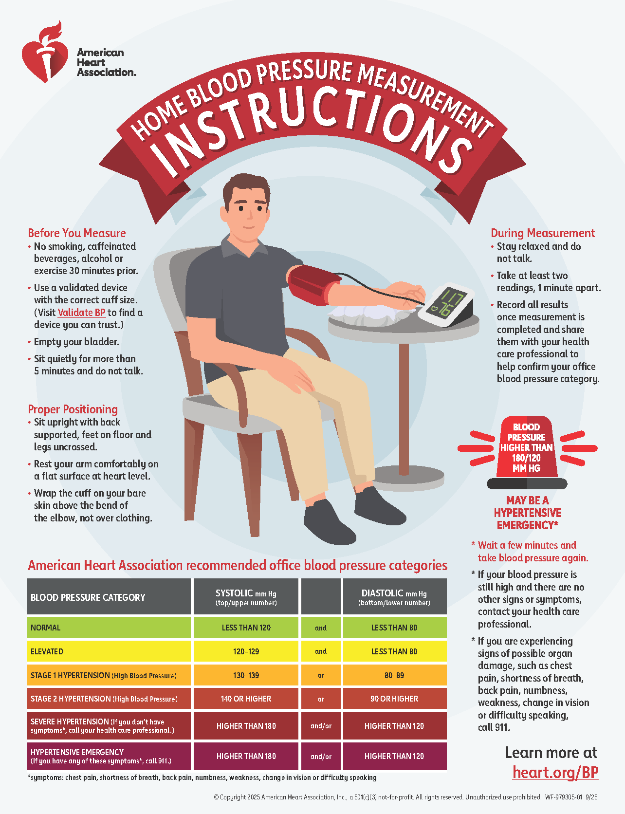 According to the American Heart Association, a healthy blood pressure is considered to be below 120/80 mmHg. Making small lifestyle changes, such as being more active, eating heart-healthy foods, reducing sodium, and managing stress, can all make a big difference in ensuring optimal health outcomes. Self-Monitored Blood Pressure (SMBP) can aid in tracking your numbers overtime. Consult with your doctor about your blood pressure numbers. Even small steps can have a big impact on your heart health!